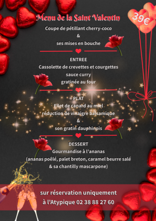Implanté à La Chapelle-Saint-Mesmin dans le Loiret (45), L’Atypique est un restaurant chic et convivial dans lequel toute l’équipe a le plaisir de vous accueillir LES MERCREDIS et JEUDIS SOIRS de 19H00 à 21h00 uniquement SUR RESERVATION et LES VENDREDIS ET SAMEDIS SOIRS à PARTIR DE 19H45 JUSQU'A 1H DU MATIN pour les soirées à thèmes.